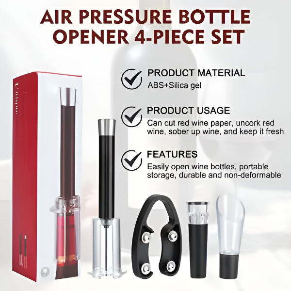Acest set 4-în-1 include un deschizător cu pompă de aer, un tăietor de folie, un aerator pentru turnare și un dop cu vid pentru o experiență perfectă a vinului.